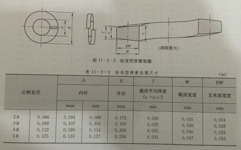 当弹簧垫圈镀层厚度超过0,0005 in,而且与之配用的螺栓、螺钉也有较厚的镀层时,垫圈内径的小值和外径的大值超出表11 - 2 - 3〜表11-2-6规定值的极限为0.020 in。